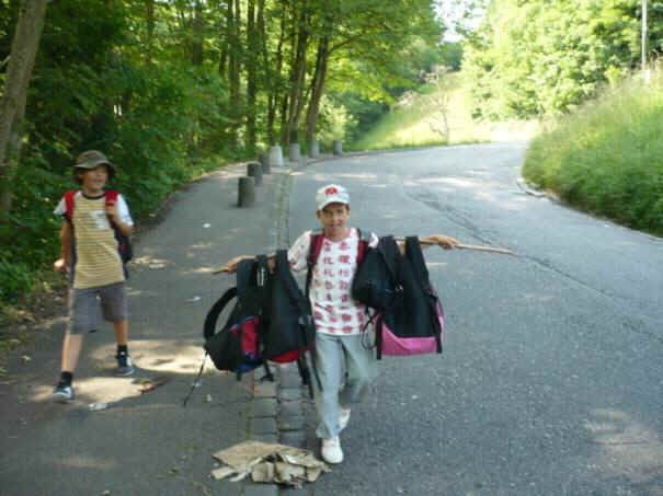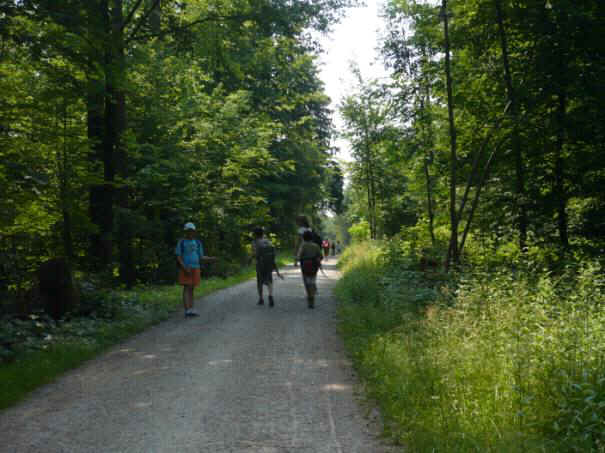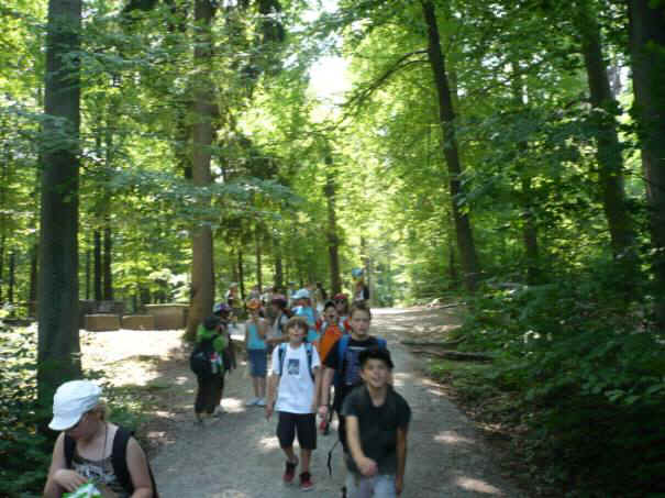 Im Wald liefen zwei Mädchen und zwei Jungs ganz langsam. Sie waren immer die letzten. Herr Zwicky sagte: „Lauft schneller.“ Zwei Jungs tragen drei Rucksäcke. Sie sind am schwitzen, weil es sehr heiss ist. Auch hier tragen zwei Jungs drei Rucksäcke. Ein paar Kinder nutzten diese Methode. Schon bald sind wir nicht mehr in Witikon. Man sieht, dass wir schon in Trichtenhausen sind, also schon in Zollikerberg. Noch 1h bis wir im Oescher ankommen. Bis dann müssen wir noch viel laufen. Zum Glück geht der Weg nach unten und nicht steil rauf.