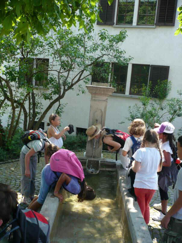 Plötzlich sahen wir einen Brunnen! Sofort ist die ganze Klasse auf den Brunnen zugerannt. Alle füllten ihre leeren Flaschen mit dem kühlen Wasser und tranken auch gleich davon. Tat das gut. Sofort waren wir wieder hellwach. Daria und ich hatten so heiss, dass wir unsere Köpfe in den Brunnentrog tauchten. Auf dem restlichen Heimweg hatten wir alle nicht mehr heiss. Wie schön kann so ein Brunnen sein.