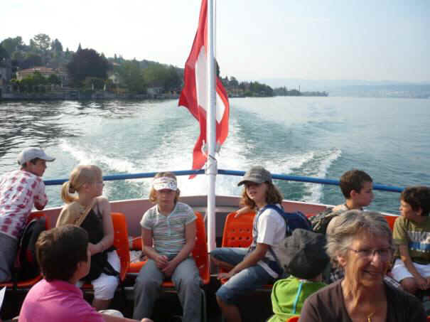 Als wir auf das Schiff gingen, sagte ein Matrose: „Seid ihr brav? Dann kommt rein!“ Wir gingen alle in den hinteren Teil des Schiffes und setzten uns auf die orangen Stühle. Dann fragte einer von uns Herr Zwicky: “Wie lange dauert die Fahrt?“ Herr Zwicky antwortete, dass wir bis zum Bürkliplatz 20 Minuten brauchen. Plötzlich fand ein Mitschüler eine Zeitung. Wir wollten alle die Zeitung lesen und das gab einen kleinen Streit. Am Ende einigten wir uns, dass wir sie zusammen lesen. Eine ältere Frau sass neben uns und sie hat uns ein paar Fragen gestellt. Wir haben ihr höflich geantwortet. Die Aussicht war wunderschön, man sah schöne Häuser und Fischer die im Zürichsee fischten.