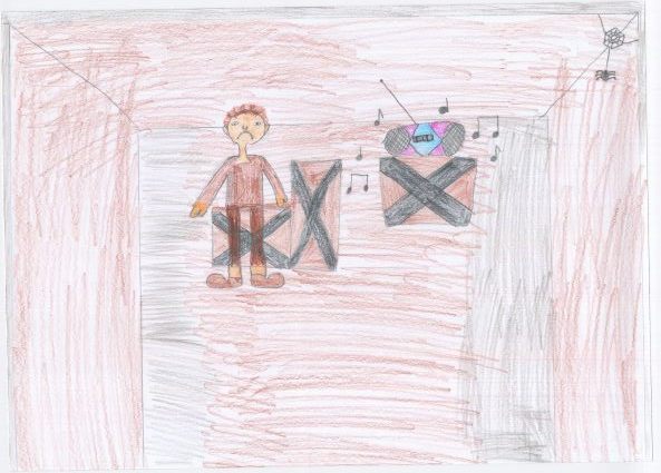 Stockwerke hinauf gehen und einen armen Mann mit einem Radio sehen. Die