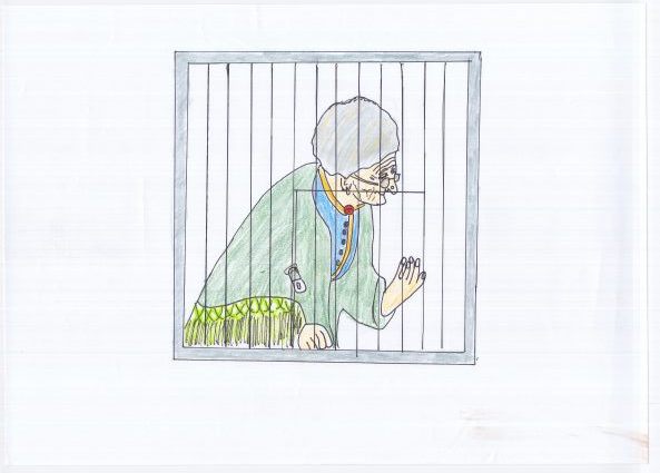 Ururururgrossmutter ist in einen Käfig eingesperrt.